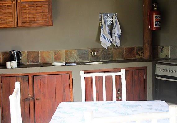Chalet with main bedroom - king size bed, one bathroom, upstairs loft with 2 single beds. Linen and mosquito nets are provided. Fully equipped kitchen includes all kitchen utensils, crockery, pots and pans, fridge/freezer combo, gas stove with oven. Table with seating for 4 persons. Outdoor shower and veranda with built-in braai and table with seating for 4 persons