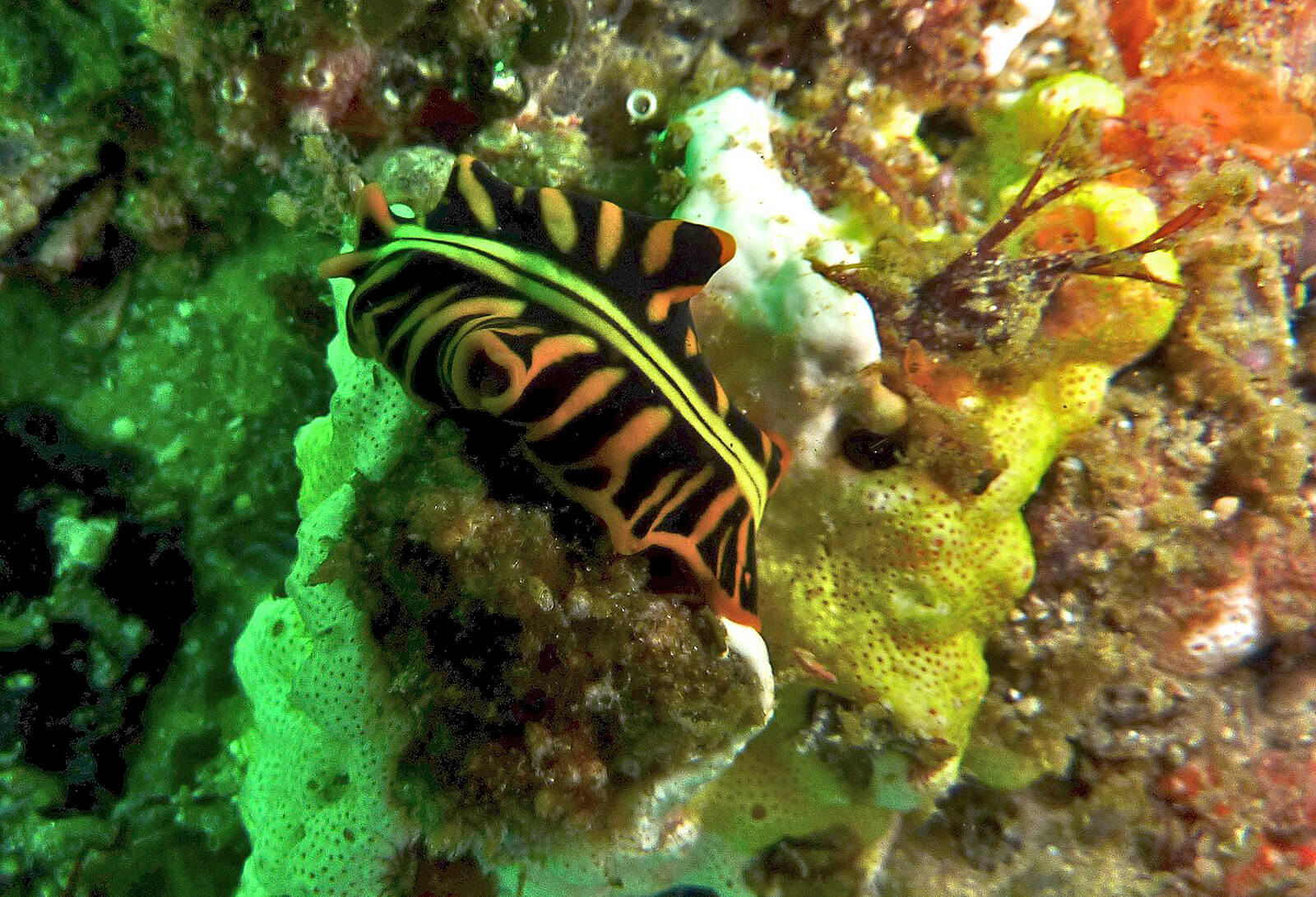 The stunning tiger flat worm nudibranch spotted along coral reefs nearby