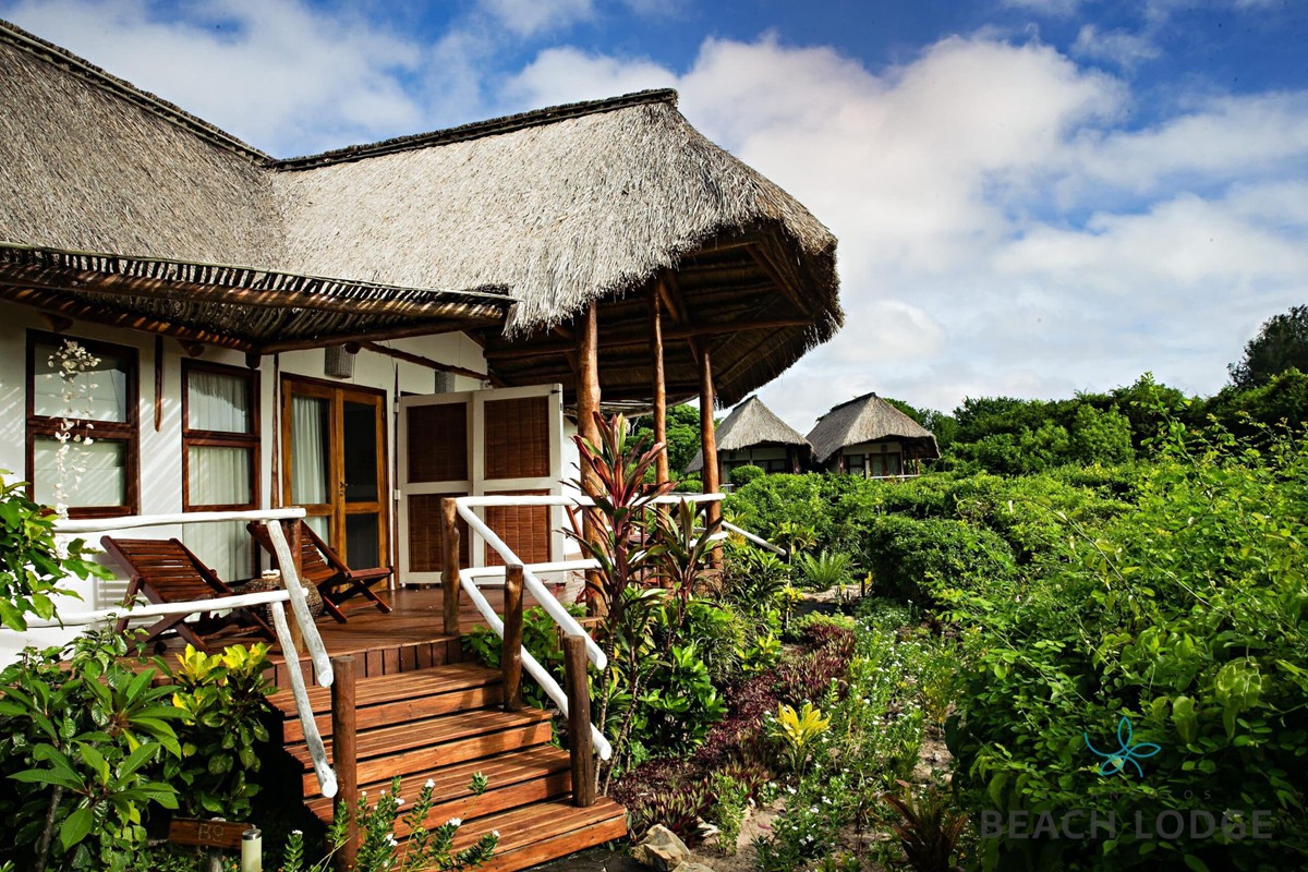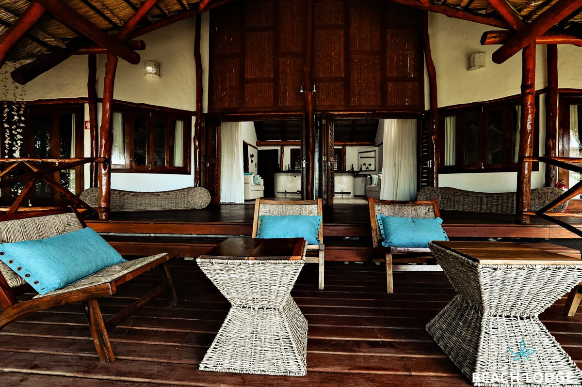 The lodge is constructed from natural indigenous elements of thatch and local hardwood simbire poles, which have been combined in perfect harmony with plaster walls and wood frame doors and windows. The result is the relaxed yet stylish finish. The property extends right on to the beach and the lodge buildings are set back about 100m up the ridge, overlooking the sea.