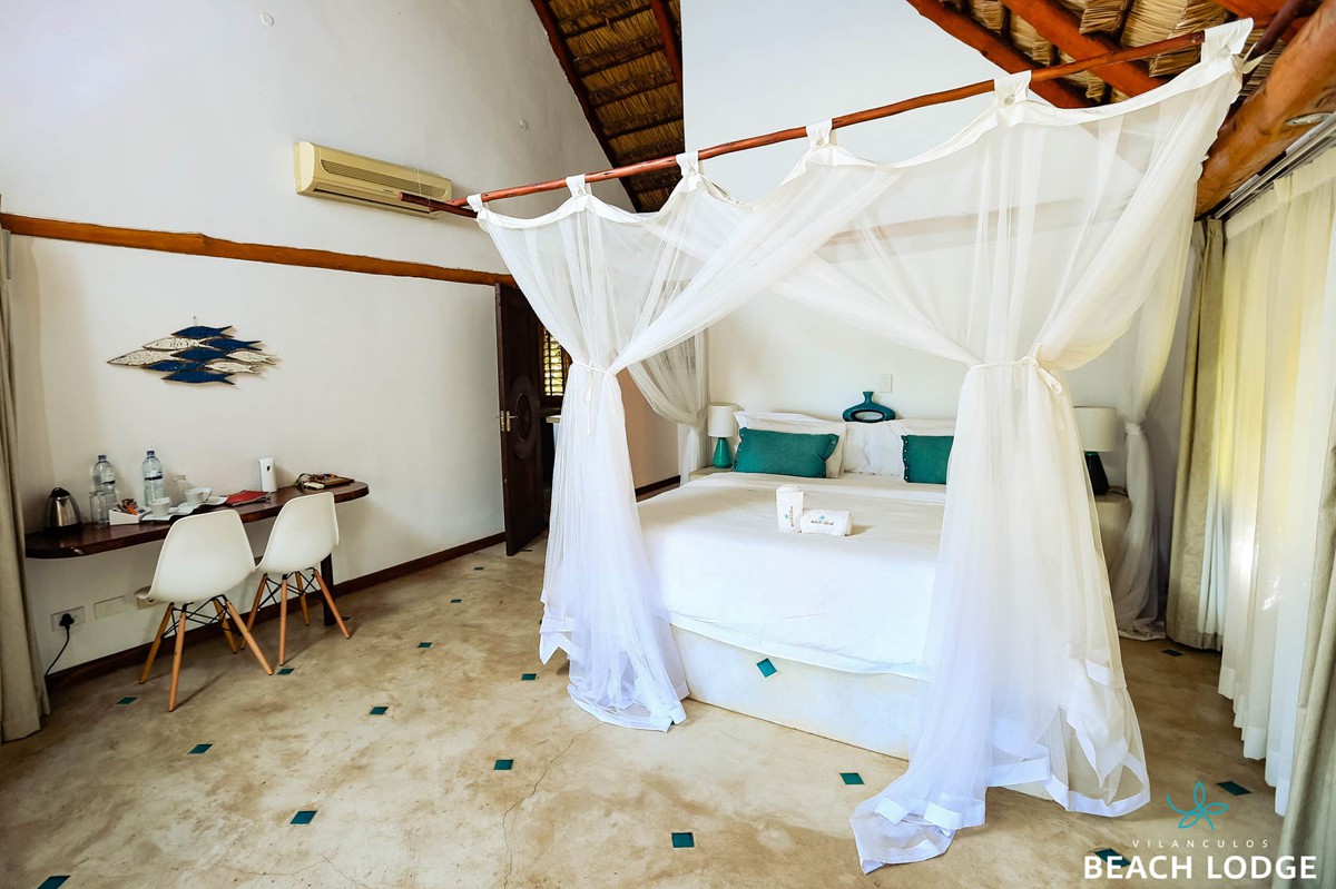 This property is also one of the top-rated locations in Vilanculo. The Suite is built on stilts and offers a superb view of the ocean and the islands in the distance. It has two en-suite rooms, a comfortable open-plan lounge as well, and a spacious covered veranda, perfect for those early morning cups of coffee or the late afternoon Sundowners. The Family Suite boasts a private deck, air-conditioning, en-suite shower, mosquito nets, safe, coffee & tea making facilities and all amenities.