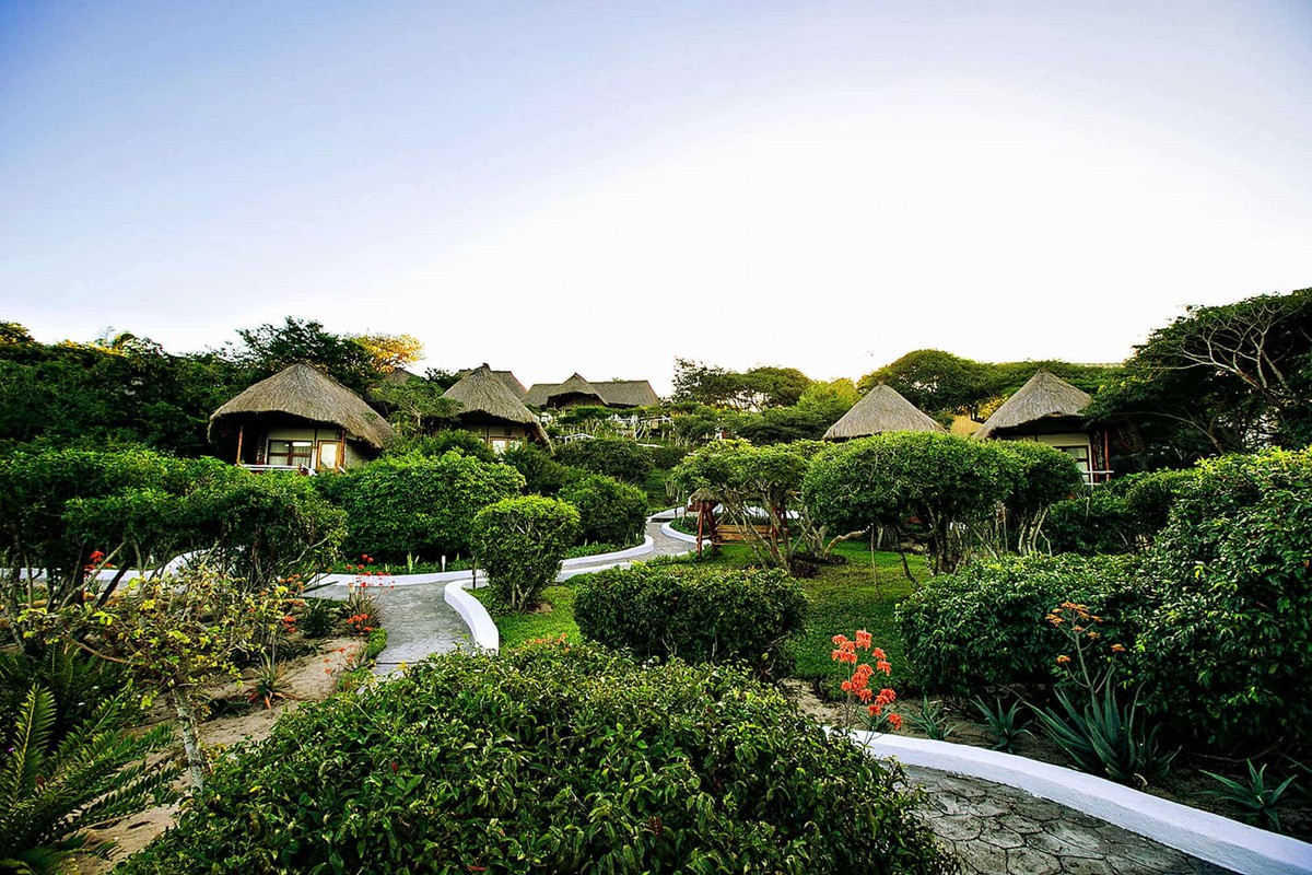 The well-kept gardens are an appealing blend of indigenous bush on the slopes around the bungalows and pathways, and tropical lush green palms and lawns of the guest entertainment areas. The rolling green lawns of the gardens around the main building, pool and pool bar are peppered with palm trees, offering shade on the hot summer days. Scattered paved areas among the trees offer quiet shaded areas for drinks.