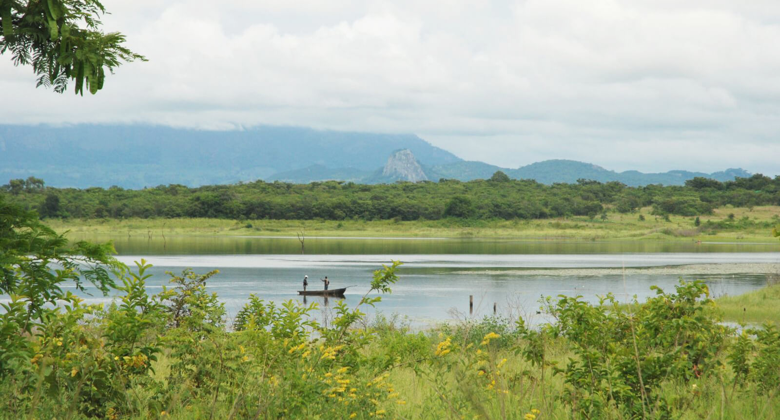 Locals fishing in the dam with the Chicamba Real mountain range in the background