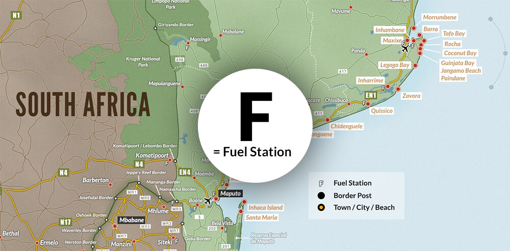 Click on the image below to view our pictorial map showing where you can locate a fuel station within Mozambique. The "F" icon represents an area with a fuel station.